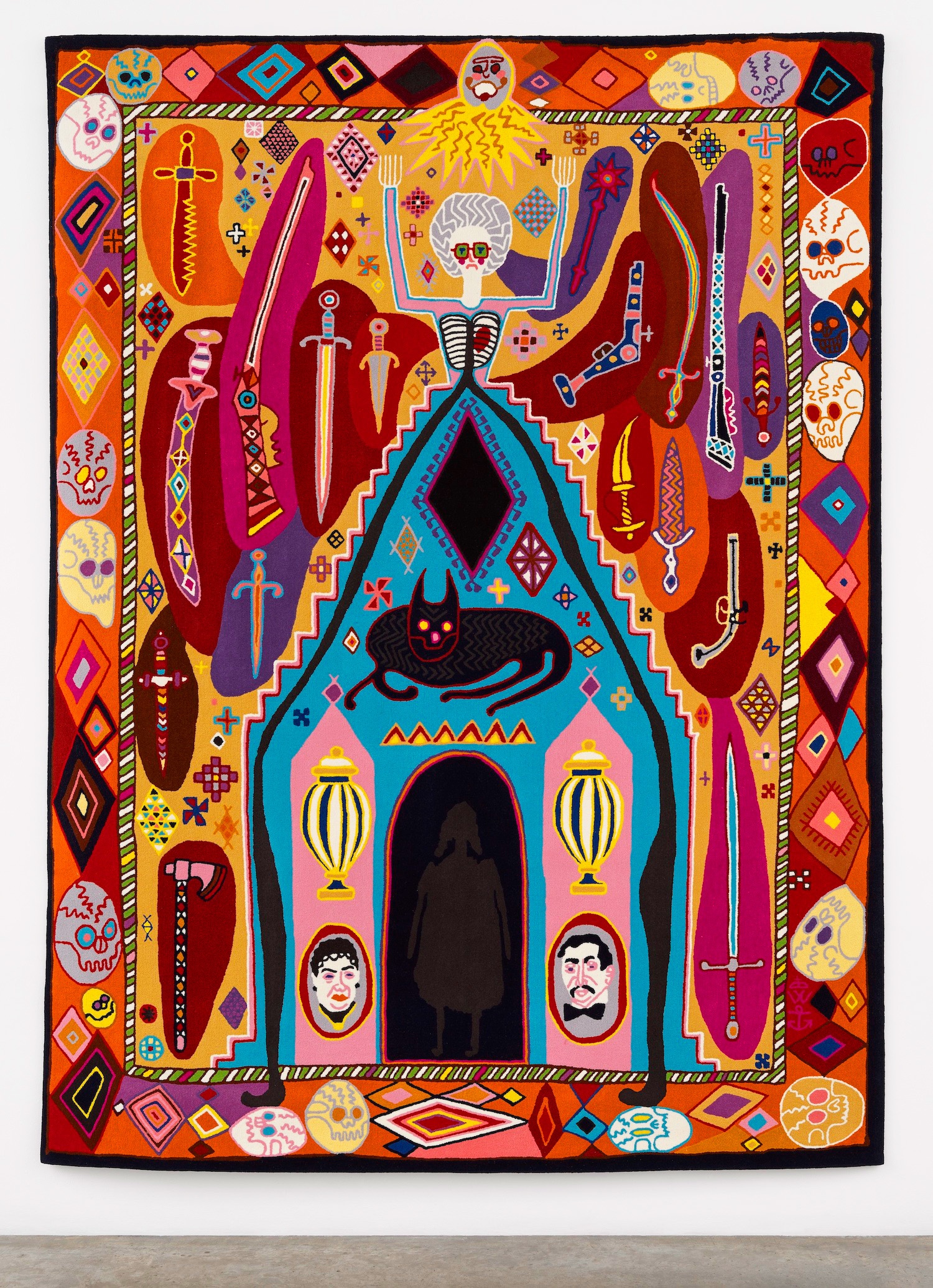 A prayer rug for the sanctuary of home and the Wallace Collection. Shirley Smith is in the centre passed out on the floor, escaping the threats of a cruel world; murderous weapons lie around her in bloody pools. Beyond the antique swords, guns and daggers, a border of skulls mock and laugh. Shirley's body is a temple. A demonic cat guards the entrance, as the shadow of her younger, traumatised self hovers in the doorway. On either side of the entrance are Sèvres urns and portraits of her adopted ancestors, Sir Richard and Lady Wallace.