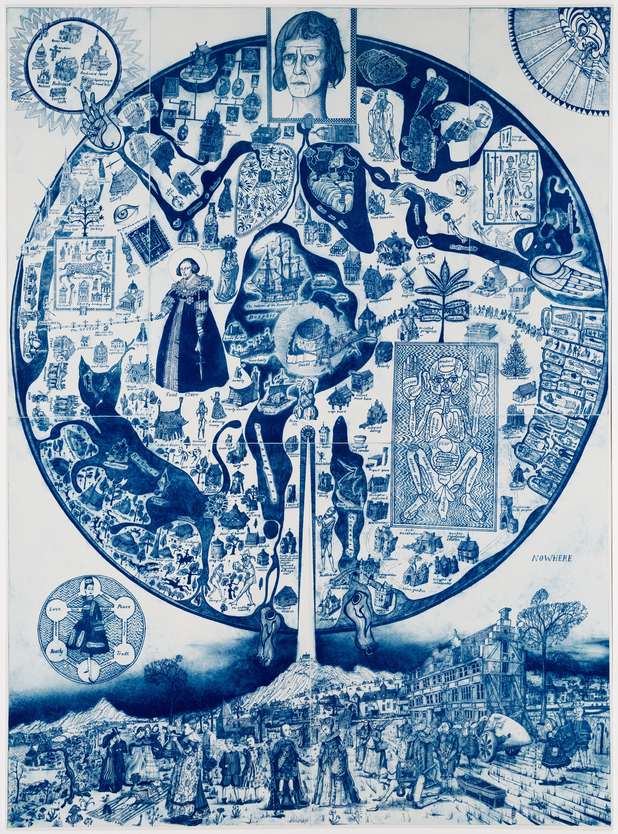 Maps have long held a fascination for Perry. His first etching, Map of an Englishman, showed an imaginary island on which the artist mapped out his own mind and emotional landscape. The idea for his third large-scale etching, Map of Nowhere, came from a book of medieval European maps of the world or Mappae Mundi. One of its illustrations showed a life-size replica of the Ebstorf map of Northern Germany, which was destroyed during the Second World War. This showed Christ’s body girding the world with his head at the top, his hands to the side and his feet underneath. Perry liked the composition and used this device for his own map of the world, but replaced Christ with his own self-portrait. The hubris of ‘I am the world’ appealed to him and has prompted his daughter to comment wryly that he is ‘putting himself forward as God’. For Perry ‘all art is self-portraiture’, but with his map the artist is also expressing his strong reservations about concrete beliefs. The title of the print comes from Thomas More’s Utopia, a title derived from the Greek ou topos, meaning ‘no place’, somewhere that does not exist. Perry rejects the notion that life is an ongoing process leading towards something – let alone God. This finds its visual expression by the placement of a little island labelled ‘doubt’ at the centre of the etching. Doubt – ‘the essence of civilization’ – has taken the place of Jerusalem, the Holy City and focal point in its medieval precursors. Pilgrims, a recurrent motif in Perry’s work, make their way towards the island. They appear again on the plain underneath the map ‘gathering for their final push before they go up to the monastery’ on the hill behind them. The coffin in the foreground is a reminder that not all will make it.