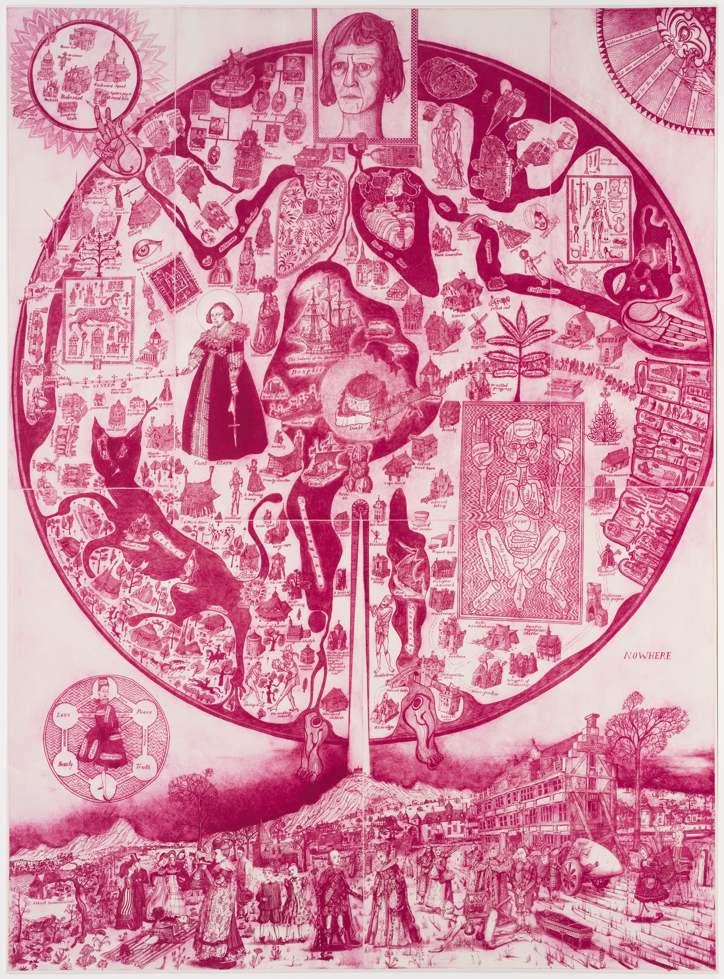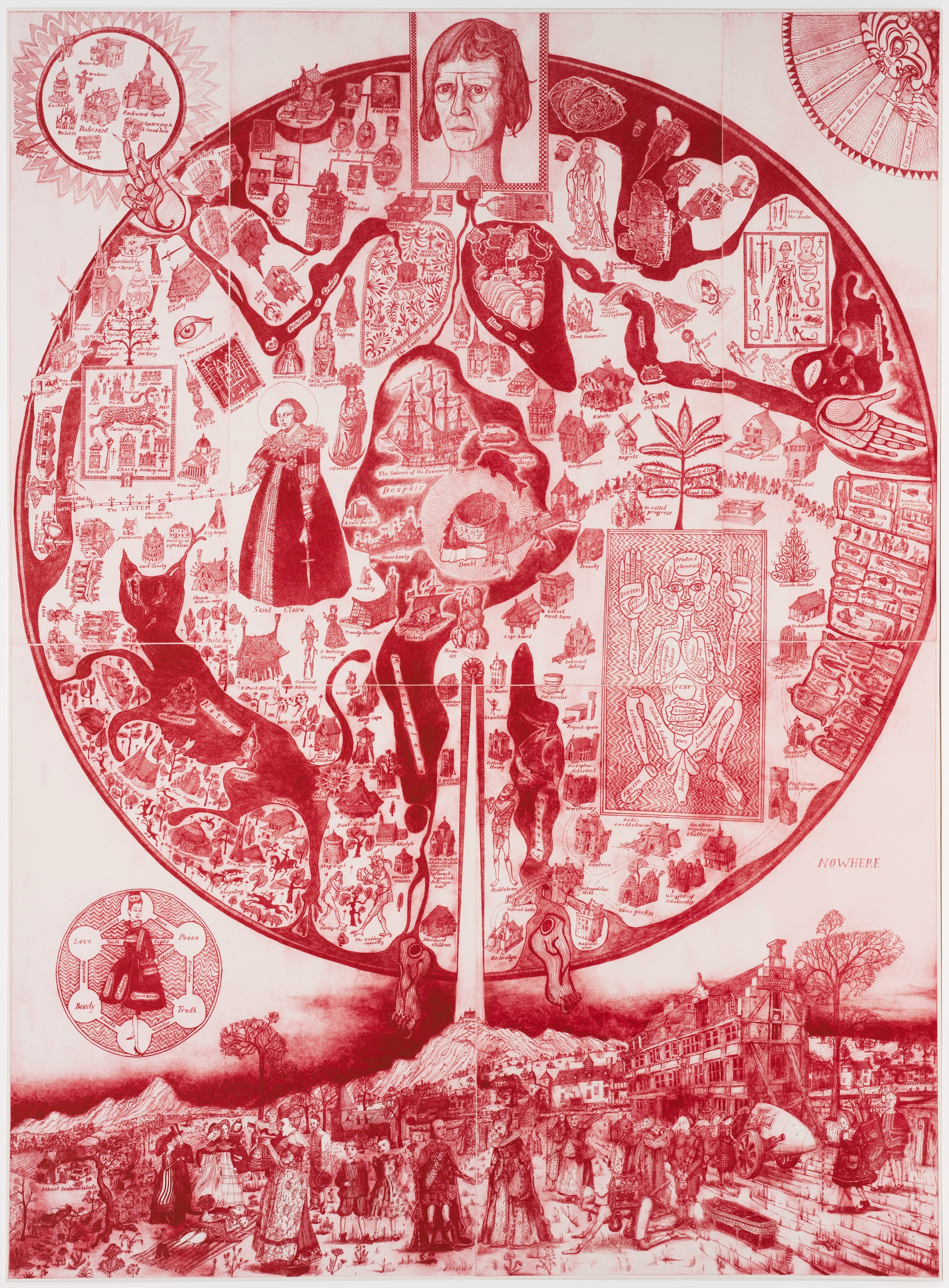 I wrote place names on the map with references to modern-day things like 'Internet dating' and 'Binge-drinking'. There are lots of jokey references to ecology and green politics. In the middle of the map is 'Doubt', because a philosopher once said: 'Doubt is the essence of civilization.' The image of a skeletal child is like an early anatomical drawing but here the child is covered in bigotries - he has 'Racism' on one hand and 'Sexism' on the other. 'Fear' is in his guts, because all bigotry starts with fear.