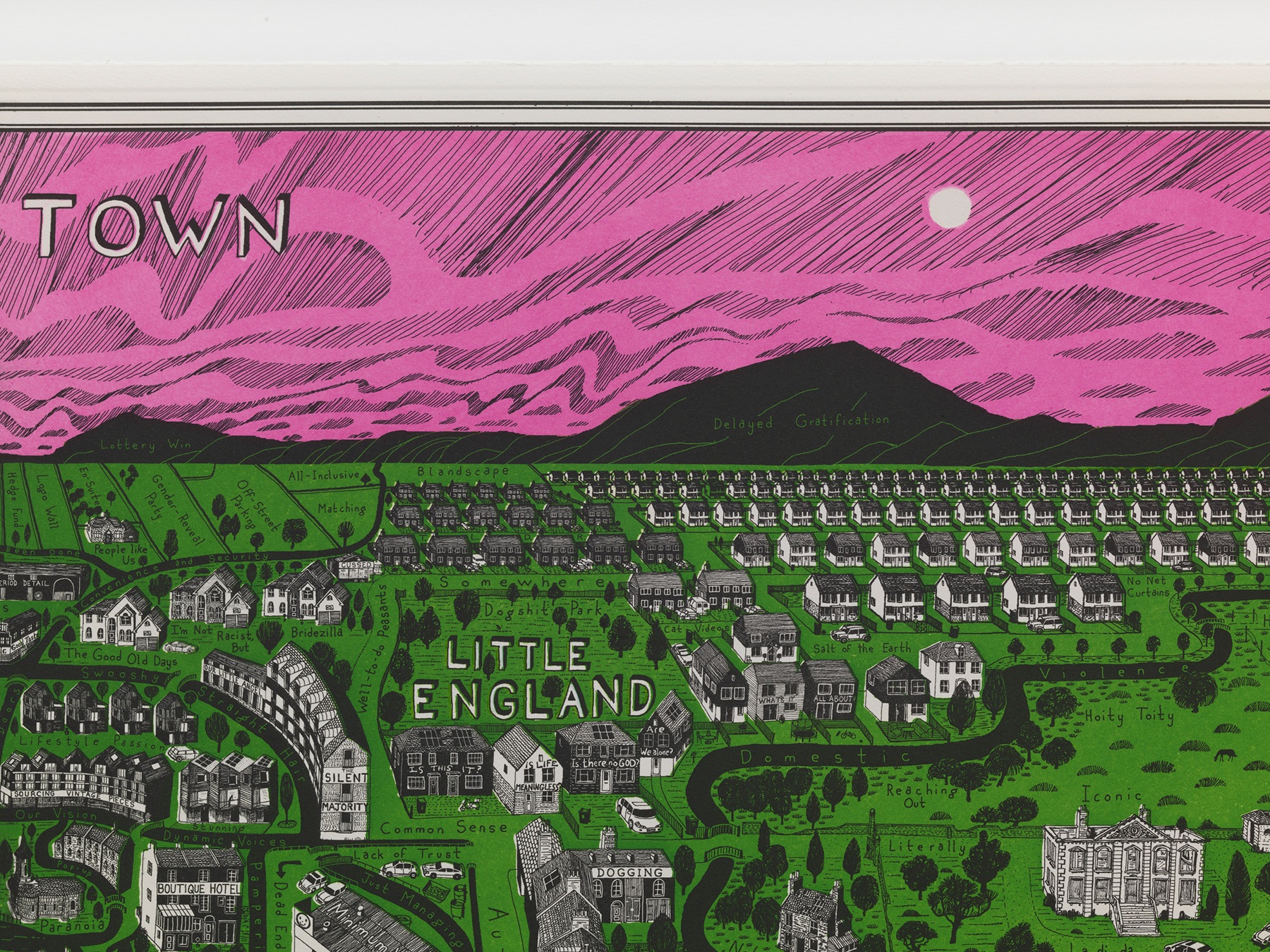 “This large etching of a small cosy town is a rough guide to the emotional geography of a society hooked on social media. A place where opinions and feelings form that perhaps are inappropriate for real life. A community of cults untroubled by the give and take of face-to-face social interaction. The districts are labelled in block letters: PHD, SMUG, IDENTARIA, COOL, SINCERITY. You can pop in for a drink at a pub called The Selfie and Socialist or Style over Substance or get lost in the boggy marshes of modern sexuality. Everywhere there are neologisms: tradwife, purity spiral, pseudoprofundity, fauxminism. Most of us live increasingly in this town. It is a place of fantasy. This map may not be much help in real life.”