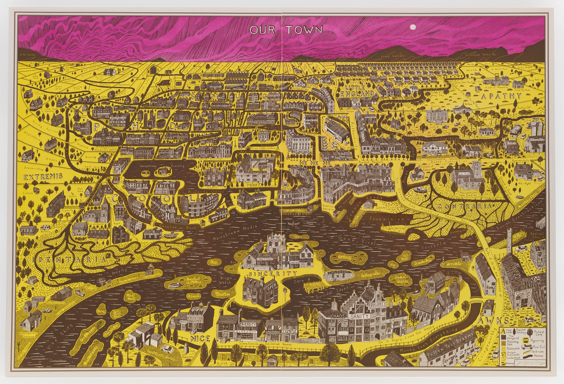 “This large etching of a small cosy town is a rough guide to the emotional geography of a society hooked on social media. A place where opinions and feelings form that perhaps are inappropriate for real life. A community of cults untroubled by the give and take of face-to-face social interaction. The districts are labelled in block letters: PHD, SMUG, IDENTARIA, COOL, SINCERITY. You can pop in for a drink at a pub called The Selfie and Socialist or Style over Substance or get lost in the boggy marshes of modern sexuality. Everywhere there are neologisms: tradwife, purity spiral, pseudoprofundity, fauxminism. Most of us live increasingly in this town. It is a place of fantasy. This map may not be much help in real life.”