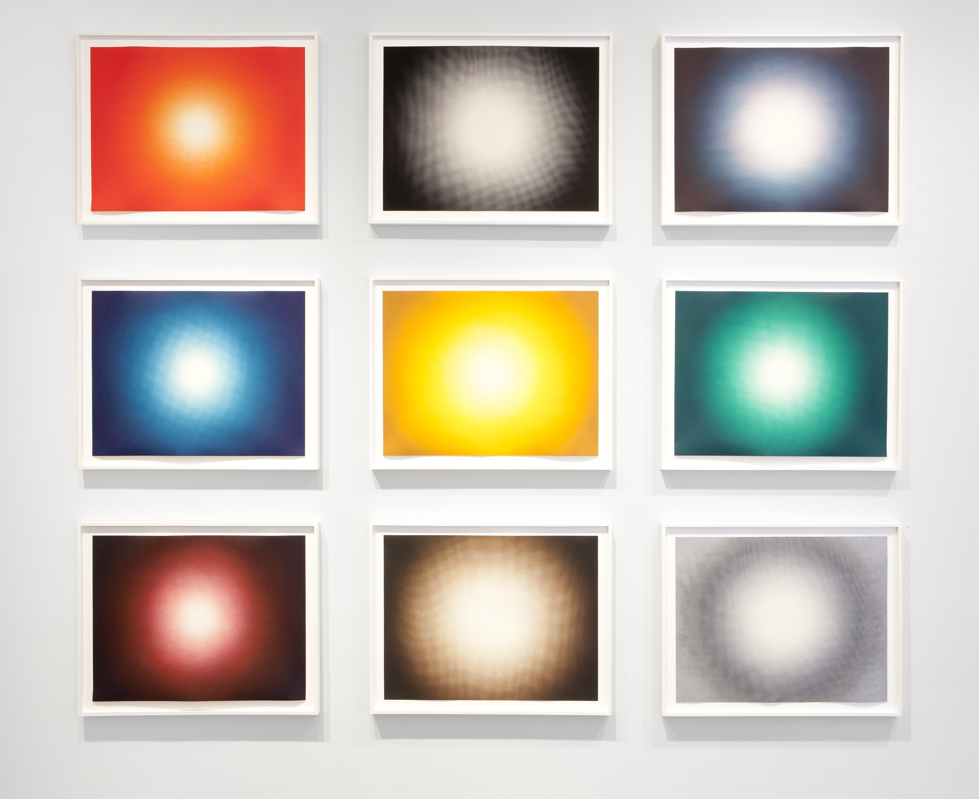 For the first series, Shadow I, he chose a vertical format, where the strong saturated colours evaporate towards a seemingly white centre. Shadow II takes the form of colour fading inward, towards a circular ethereal centre. For the third series, Shadow III, the size of the prints was doubled, but its horizontal lines are a variation on the first series. All prints are printed from two plates combining to shades of yellow, green, blue etc. Kapoor gently and gradually altered the subtle tonal range over the succession of the series. The three Shadow series are the visual equivalent of a fugue, and Kapoor has given each series its own unique character.